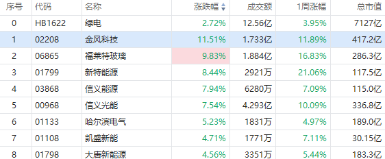 9月5日讯,港股绿电概念早盘领涨大市,截至发稿,金风科技涨超10%,福莱特玻璃涨超9%,新特能源涨超8%,信义能源、信义光能涨超7%。