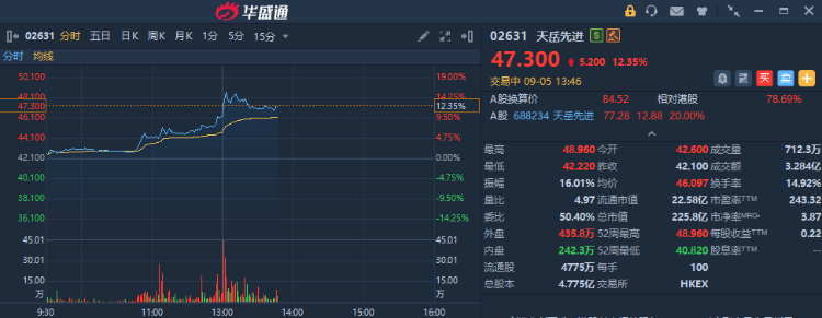 华盛资讯9月5日讯,天岳先进港股盘中大涨超12%,现报47.3港元。