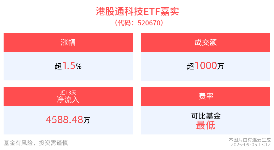 截至2025年9月5日 13:12,港股通科技ETF嘉实(520670)上涨1.52%;成分股方面,英诺赛科涨超5%,中芯国际涨近4%,华虹半导体、迈富时等跟涨。