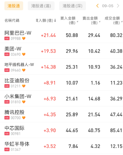 阿里巴巴-W、美团-W、地平线机器人-W分别获净买入21.44亿港元、19.53亿港元、14.38亿港元;