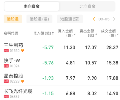 三生制药、快手-W、晶泰控股分别遭净卖出5.77亿港元、5.76亿港元、1.93亿港元。