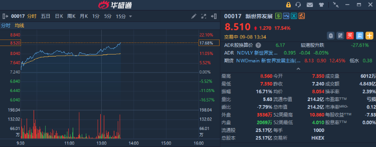 新世界发展午后涨超17%,现报8.51港元,成交额超4.8亿港元。