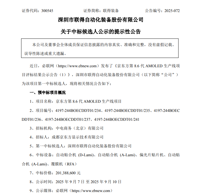 9月8日,联得装备(300545.SZ)公告称,公司为京东方第8.6代AMOLED生产线项目第一中标候选人,中标设备包括自动贴合机(D-Lami)、自动贴合机(A-Lami)、偏光片贴片机、自动贴合机(A-Lami)、覆膜机(RFA),中标价格为2.01亿元。该项目尚处于中标候选人公示阶段,公司尚未收到《中标通知书》,最终能否中标、正式合同的签订仍存在不确定性。
