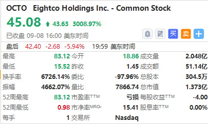 截至收盘,电商管理平台Eightco Holdings $OCTO 周一收涨3008.97%,盘中涨幅一度达到惊人的5632%。收盘时公司的总市值为1.37亿美元。