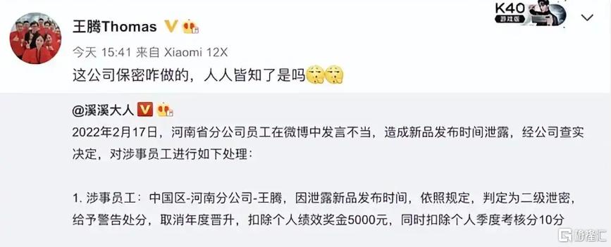 2022年2月17日,当网友在微博评论区问出 “腾哥,标准版什么时候发布呢?” 时,王腾一句随性的 “下个月” ,直接将Redmi K50标准版3月发布的机密公之于众。彼时他担任小米河南省分公司总经理,却在拥有百万粉丝的社交账号上将未公开的产品发布时间轻易公之于众。
