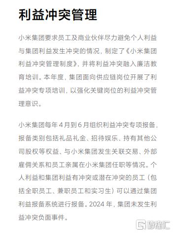 翻阅小米在2024年年底发布的ESG报告可以发现,其在“利益冲突管理”一项上做了如下表述:小米集团要求员工及商业伙伴尽力避免个人利益与集团利益发生冲突的情况,制定了《小米集团利益冲突管理制度》,并将利益冲突融入廉洁教育培训。