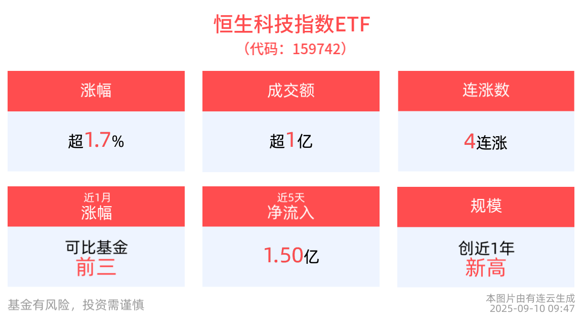 截至2025年9月10日 09:56,恒生科技指数强势上涨1.77%,成分股哔哩哔哩-W上涨5.35%,金蝶国际上涨4.48%,阿里巴巴-W上涨4.09%,阿里健康,腾讯音乐-SW等个股跟涨。恒生科技指数ETF(159742)上涨2.28%, 冲击4连涨。最新价报0.81元。拉长时间看,截至2025年9月9日,恒生科技指数ETF近1周累计上涨1.15%,涨幅排名可比基金3/10。