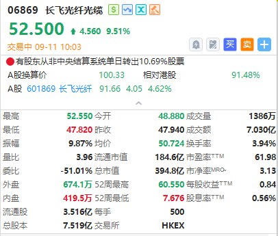 长飞光纤光缆涨超9%,年内累涨超340%!光通信技术迎重大突破,机构指公司空芯技术产能水平领先。