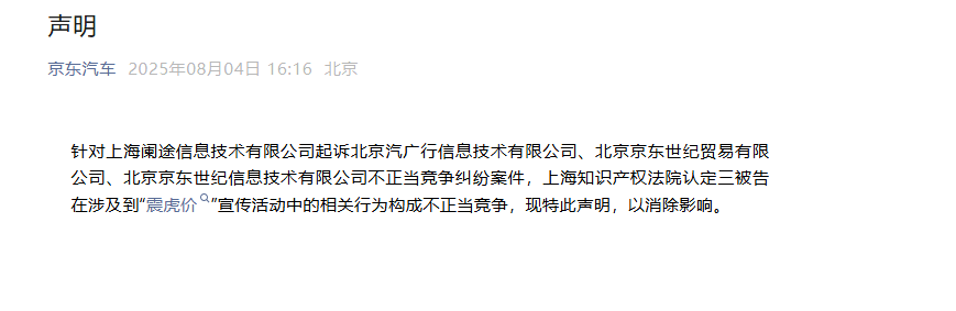 判决落地之后,8月4日,京东汽车在官方微信号发布声明称,针对上海阑途信息技术有限公司起诉北京汽广行信息技术有限公司、北京京东世纪贸易有限公司、北京京东世纪信息技术有限公司不正当竞争纠纷案件,上海知识产权法院认定三被告在涉及到“震虎价”宣传活动中的相关行为构成不正当竞争,现特此声明,以消除影响。