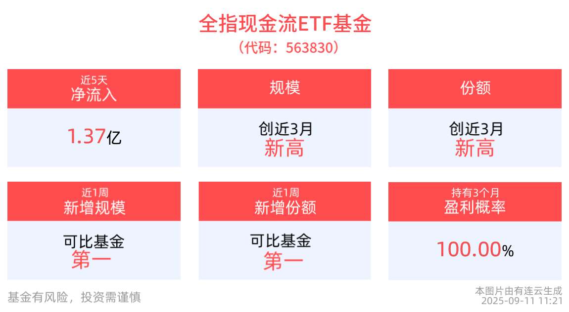 资金流入方面,全指现金流ETF基金最新资金净流入1.37亿元。拉长时间看,近5个交易日内,合计“吸金”1.37亿元。