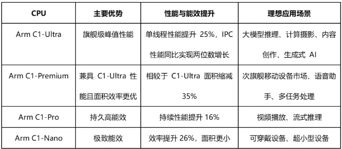 新一代搭载 SME2 技术的 Armv9.3 CPU 集群:包括 Arm C1-Ultra 和 Arm C1-Pro,为旗舰设备提供支持;