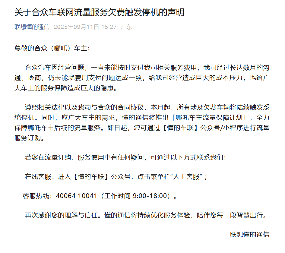 9月11日下午,联想懂的通信发布关于合众车联网流量服务欠费触发停机的声明。声明称,合众汽车(哪吒)因经营问题,一直未能按时支付公司相关服务费用,公司经过长达数月的沟通、协商,仍未能就费用支付问题达成一致。遵照相关法律以及公司与合众的合同协议,本月起,所有涉及欠费车辆将陆续触发系统停机。同时,应广大车主的需求,懂的通信将推出“哪吒车主流量保障计划”,全力保障哪吒车主后续的流量服务。