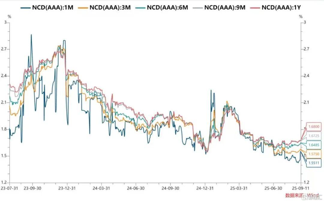 全国和主要股份制银行一年期同业存单二级市场上最新成交在1.68%附近。