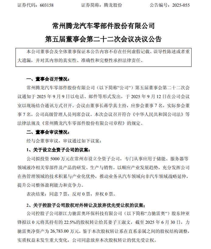 9月12日,腾龙股份(603158.SH)公告称,公司拟投资5000万元在常州市设立全资子公司,专门从事应用于储能、服务器等领域液冷相关零部件及产品的研发、生产与销售。以顺应产业发展趋势,充分发挥公司在热管理领域的技术积累与产业化优势,推动业务从汽车领域向非汽车领域战略延伸,提升公司整体盈利能力和竞争力。