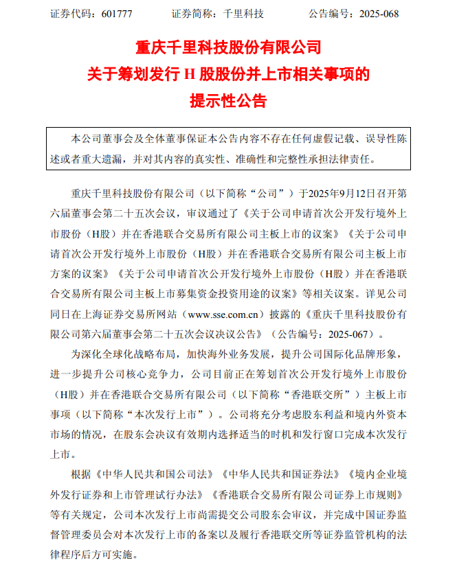 9月12日,千里科技(601777.SH)公告称,公司于2025年9月12日召开董事会,审议通过首次公开发行境外上市股份(H股)并在香港联交所主板上市的议案。公司计划通过此次发行深化全球化战略布局,加快海外业务发展,并提升公司国际化品牌形象和核心竞争力。该事项尚需提交股东会审议,并完成中国证监会备案及香港联交所等机构的审核程序。目前具体细节尚未确定,发行上市存在不确定性。