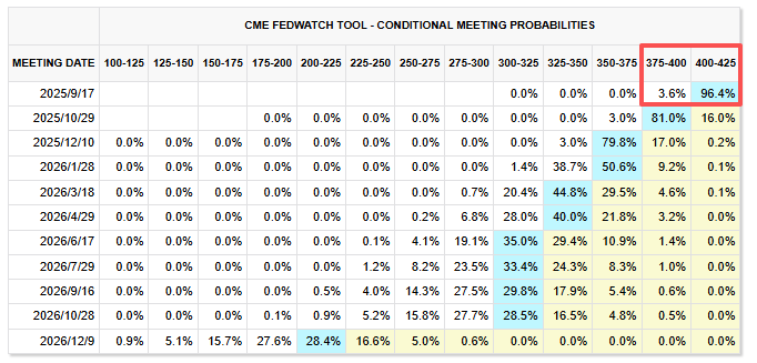 按照 “美联储观察”工具显示,本周三FOMC有96.4%的概率将祭出25个基点的降息,将美国政策利率区间下降至4%-4.25%。还有极其微弱的可能性会降息50个基点。