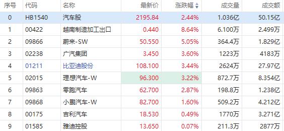 汽车股涨幅居前,截至发稿,蔚来-SW(09866)涨5.05%,报50.55港元;广汽集团(02238)涨3.6%,报3.45港元;比亚迪股份(01211)涨3.44%,报108.1港元;零跑汽车(09863)涨2.87%,报62.7港元。