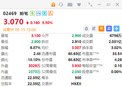粉笔(02469)涨超5%,截至发稿,涨5.5%,报3.07港元,成交额2.031亿港元。