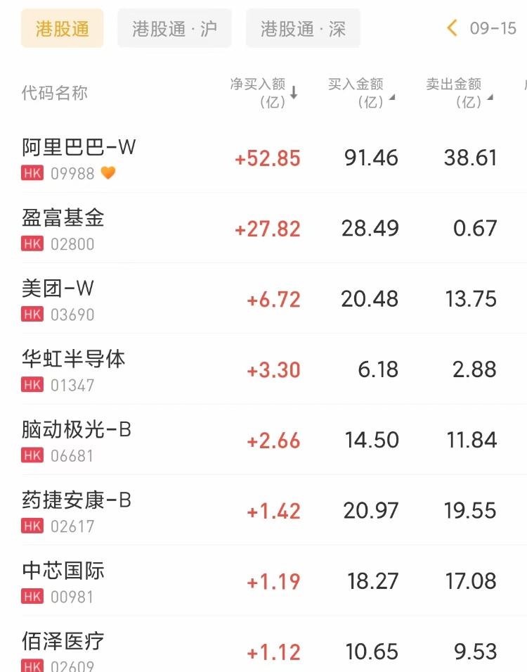 南向资金买入阿里巴巴-W 52.85亿港元,卖出小米集团-W 7.19亿港元