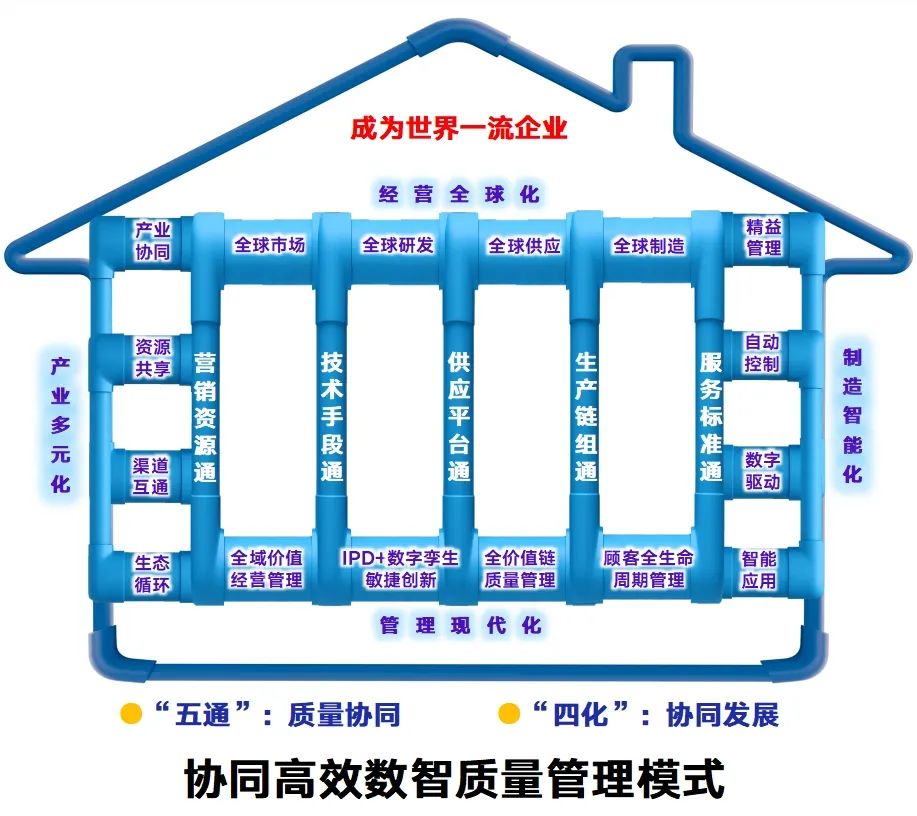 从“智能化”迈向“智慧化”,从“工厂”迈向“全生产链条”,中国联塑目前总结创立的“协同高效数智质量管理模式”,以智能工业互联网平台为基础,实现智能制造及全业务链条数字化运营,全方位贯通“资源、技术、供应链、生产链、服务”五个环节,通过此“五通”形成全价值链质量管控和产业链质量协同。
