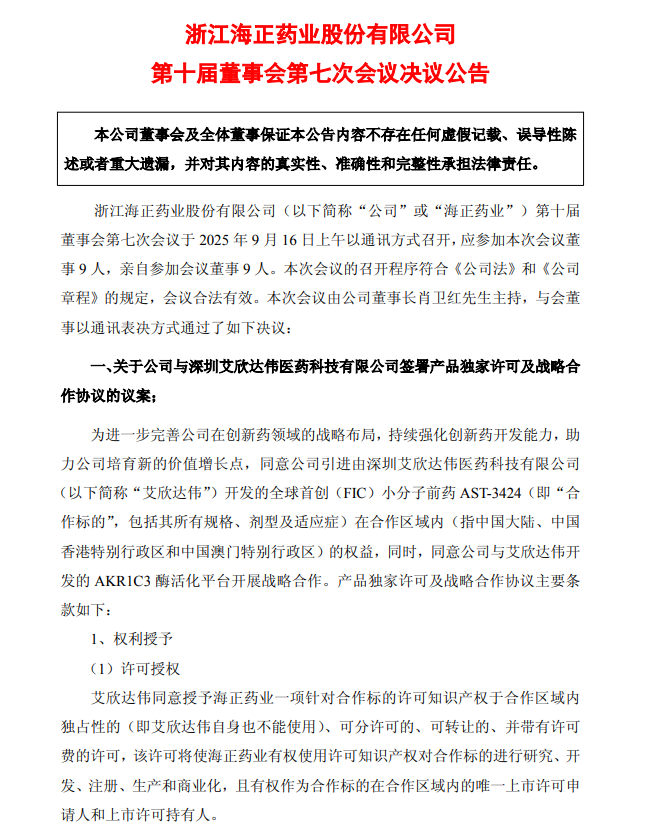 9月16日,海正药业(600267.SH)公告称,公司与深圳艾欣达伟医药科技有限公司签署产品独家许可及战略合作协议。公司拟引进由艾欣达伟开发的全球首创(FIC)小分子前药AST-3424在合作区域内(指中国大陆、中国香港特别行政区和中国澳门特别行政区)的权益,公司将向艾欣达伟支付首付款,并根据开发里程碑事件实际达成情况向艾欣达伟支付开发里程碑款,总费用累计不超过2.4亿元。同时,公司与艾欣达伟开发的AKR1C3酶活化平台开展战略合作。