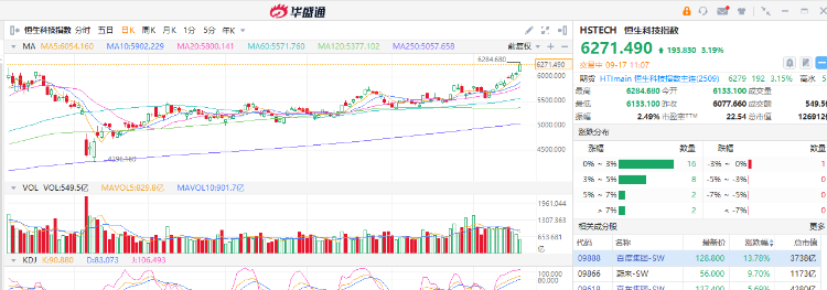 港股三大指数早盘成交活跃,其中恒生科技指数大涨超3%,创下2021年11月以来新高。恒生指数涨超1.3%