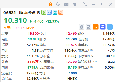脑动极光-B(06681)早盘高见13.8港元创上市以来新高,午后跌幅扩大逾12%,全天振幅达32%。值得注意的是,该股此前连续四个交易日走高,累计涨幅高达1.25倍。