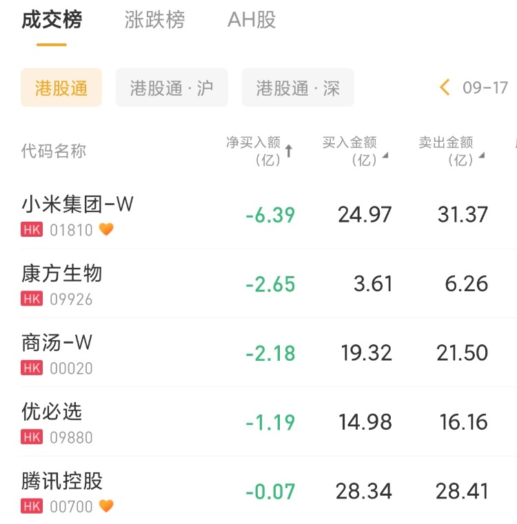 小米集团-W、康方生物、商汤-W分别遭净卖出6.39亿港元、2.65亿港元、2.18亿港元。