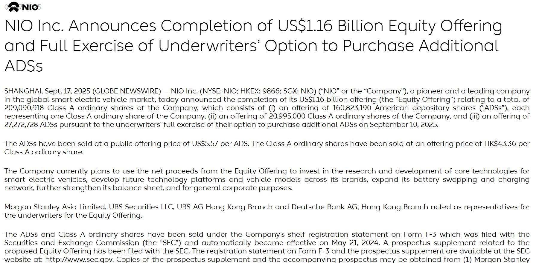 9月17日,蔚来(NIO.US)汽车发布公告称,已完成总额达11.6亿美元的股票发行,涉及总计209,090,918股A类普通股。