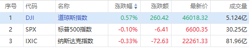 截至收盘,道指涨260.42点,涨幅为0.57%,报46018.32点;纳指跌72.63点,跌幅为0.33%,报22261.33点;标普500指数跌6.41点,跌幅为0.10%,报6600.35点。
