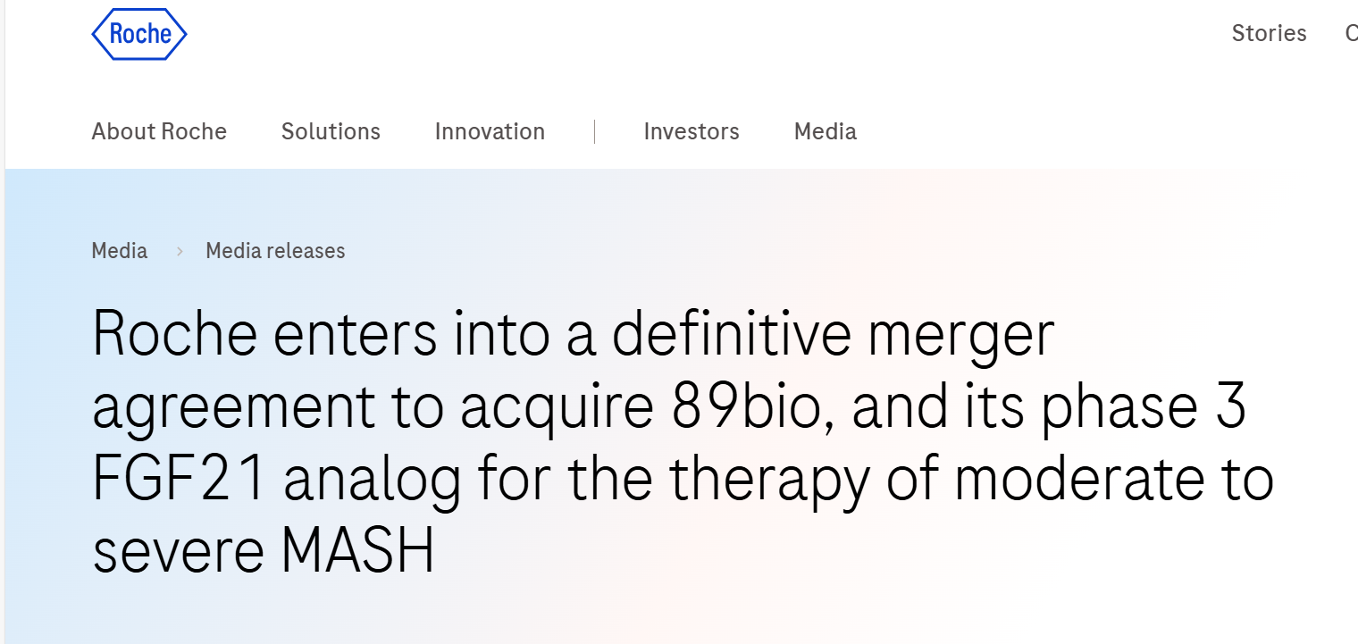 9月18日,瑞士制药巨头罗氏发布公告称,已与89bio (ETNB.O)达成最终合并协议。