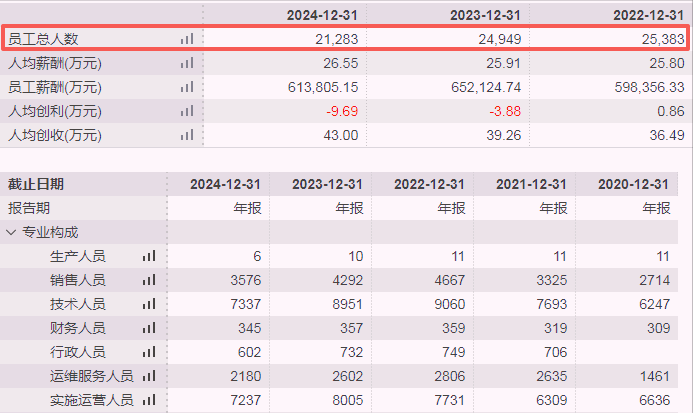减员增效是常见路径,2024年末和2022年末相比,用友的员工总数减少4100人,降超过16%,技术人员同步减少1700余人。