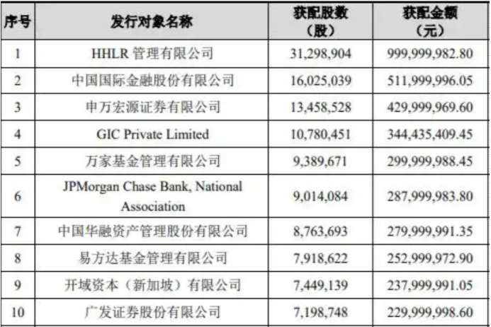 用友上一次定增还是在2022年1月,距今三年半,当时以每股发行价31.95元,募资近53亿元,包括高瓴、中金公司以及葛卫东等共17家股东(上表为前十)入场。