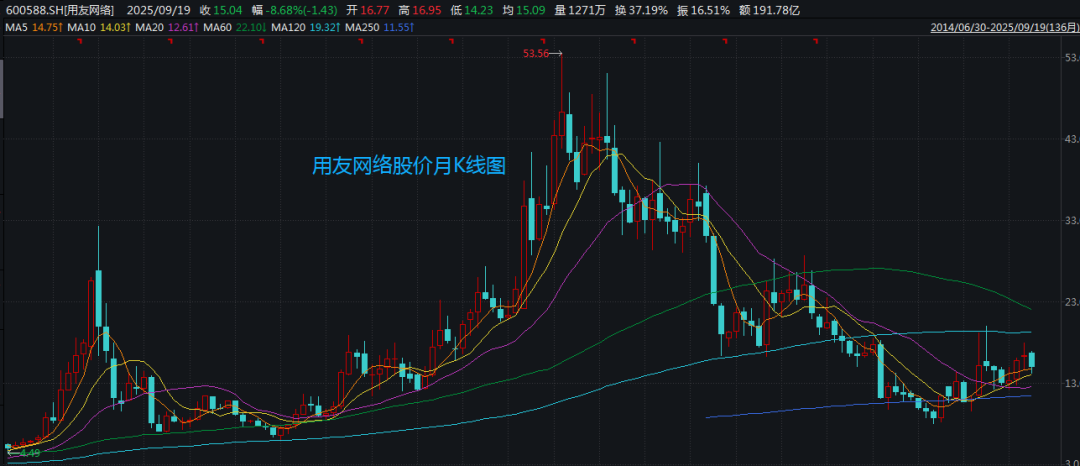 用友历史最高价曾超过53元(复权),至9月18日收盘价不足15元。2022年1月参与定增的股东,半年后解禁,单从那时起用友股价一直没有回到定增价格以上,如果股东舍不得割肉,当前还在腰斩中。