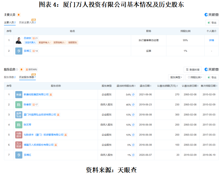 不仅如此,2017年5月,陈艺琴还与勾陈资本一同入股厦门万人投资有限公司(下称“万人投资”),而万人投资实控人正是吕俊钦,2018年6月,陈艺琴悄然退出万人投资股东行列。