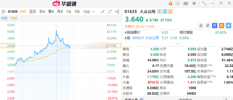 大众公用AH股齐涨,A股涨停,报5.51元;H股盘中一度暴涨40%,截至发稿涨超27%。