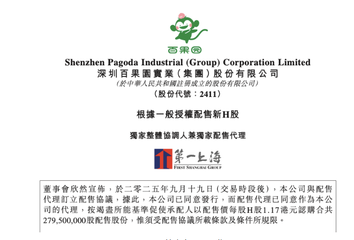 9月21日晚间,百果园集团(02411.HK)在港交所发布公告称,公司于9月19日(交易时段后)与配售代理订立配售协议,拟以每股1.17港元的价格发行2.795亿股H股,配售股份将占经扩大后H股总数的约16.1%,占全部股份总数的约15.4%。预计此次配售所得款项净额约3.25亿港元。