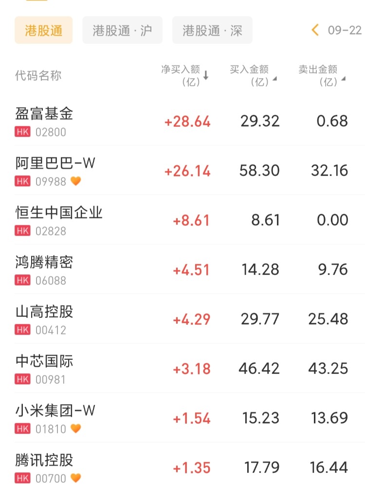 盈富基金、阿里巴巴-W 、恒生中国企业分别获净买入28.64亿港元、26.14亿港元、8.61亿港元;