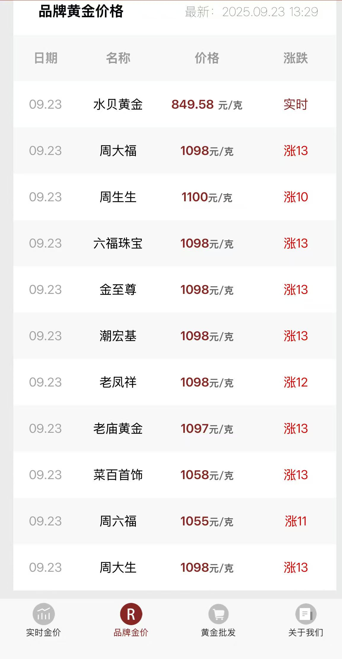 受国际金价影响,国内足金饰品价格进一步上调。数据显示,多家国内品牌金店足金饰品价格较前一日有所上涨。根据今日金价小程序,截至9月23日,周生生足金饰品价格升至1100元/克,单日上涨10元;周大福、潮宏基、周大生等多个品牌足金饰品价格为1098元/克,单日上涨13元;老凤祥足金饰品价格为1098元/克,单日上涨12元;老庙黄金足金饰品价格为1097元/克,单日上涨13元。