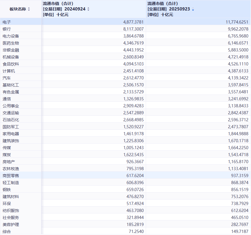 回顾过去一年(2024年9月24日—2025年9月23日),同花顺iFinD数据显示,A股板块流通市值(合计)增量榜单前五位中,通信电子行业占据三席:电子行业市值增加6.897万亿元、电力设备增加2.901万亿元、机械设备增加2.121万亿元、计算机增加1.936万亿元、通信增加1.915万亿元,科技相关板块的市值增长优势显著。