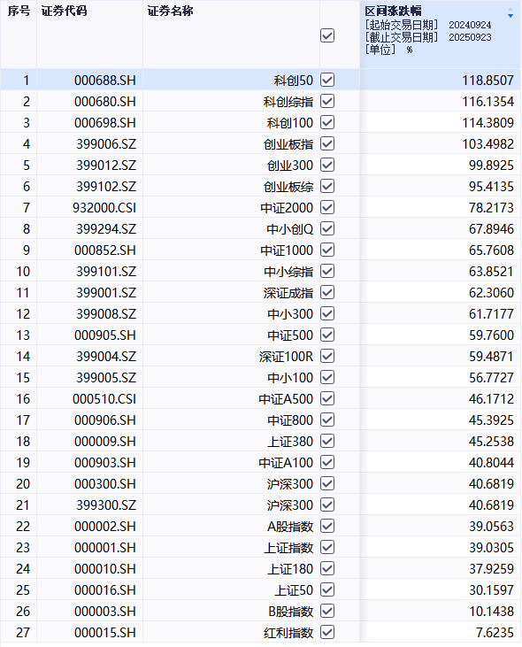 在科技股的带领下,A股从2025年4月开始进入新的上涨周期:市场在3040点附近筑底后重新发力,至8月突破去年高点,创下近4年新高,正式开启“924”之后的第二轮上涨——与第一阶段普涨不同,这一轮上涨呈现出鲜明的结构性特征,硬科技公司成为最大赢家。同花顺iFinD数据显示:2024年9月24日至2025年9月23日,创业板指上涨103.5%,科创50指数上涨118.85%,远超上证指数39.03%的涨幅,科技成长赛道的超额收益十分突出。