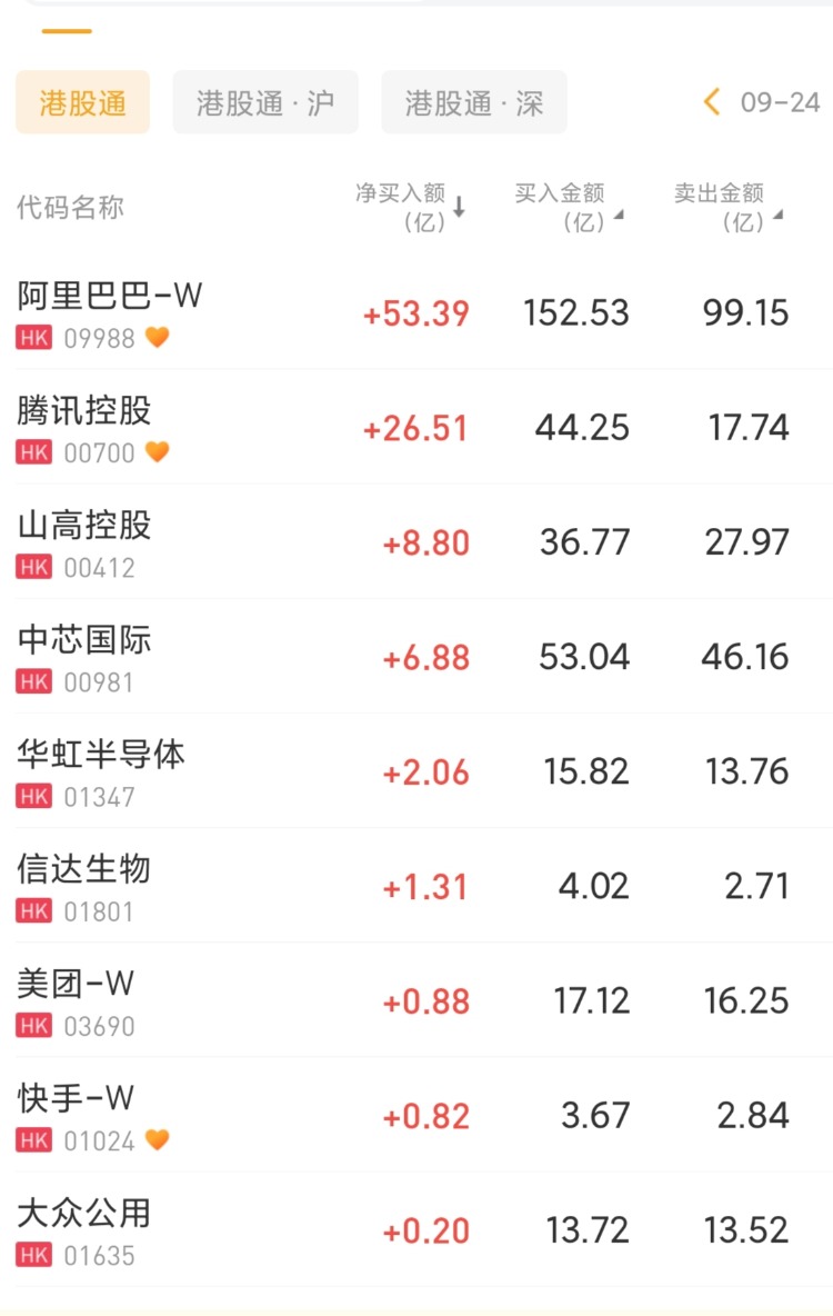 阿里巴巴-W、腾讯控股、山高控股分别获净买入53.39亿港元、26.51亿港元、8.8亿港元;