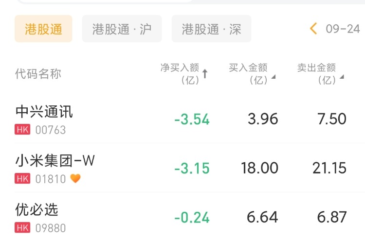 中兴通讯、小米集团-W、优必选分别遭净卖出3.54亿港元、3.15亿港元、2360万港元。