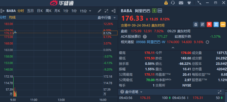 华盛资讯9月24日消息,热门中概股开盘集体走强,受3800亿基建+英伟达合作消息提振,阿里巴巴涨超8%。