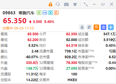 零跑汽车(09863)涨超5%,截至发稿,涨5.4%,报65.35港元,成交额3.519亿港元。