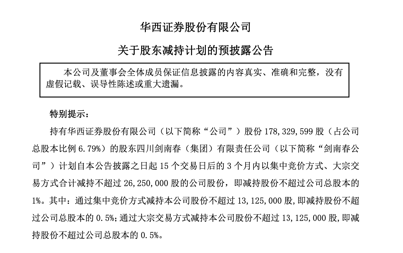 剑南春25年来首度减持华西证券,拟套现超2.5亿