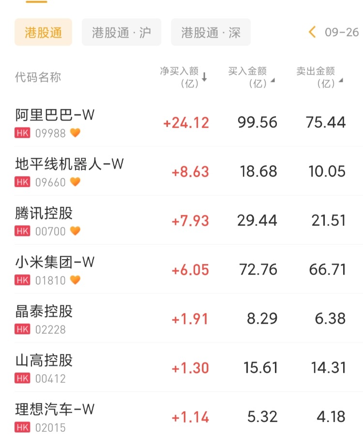 阿里巴巴-W 、地平线机器人-W、腾讯控股分别获净买入24.12亿港元、8.63亿港元、7.93亿港元;