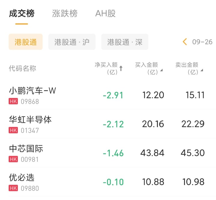 小鹏汽车-W 、华虹半导体、中芯国际分别遭净卖出2.91亿港元、2.12亿港元、1.46亿港元。