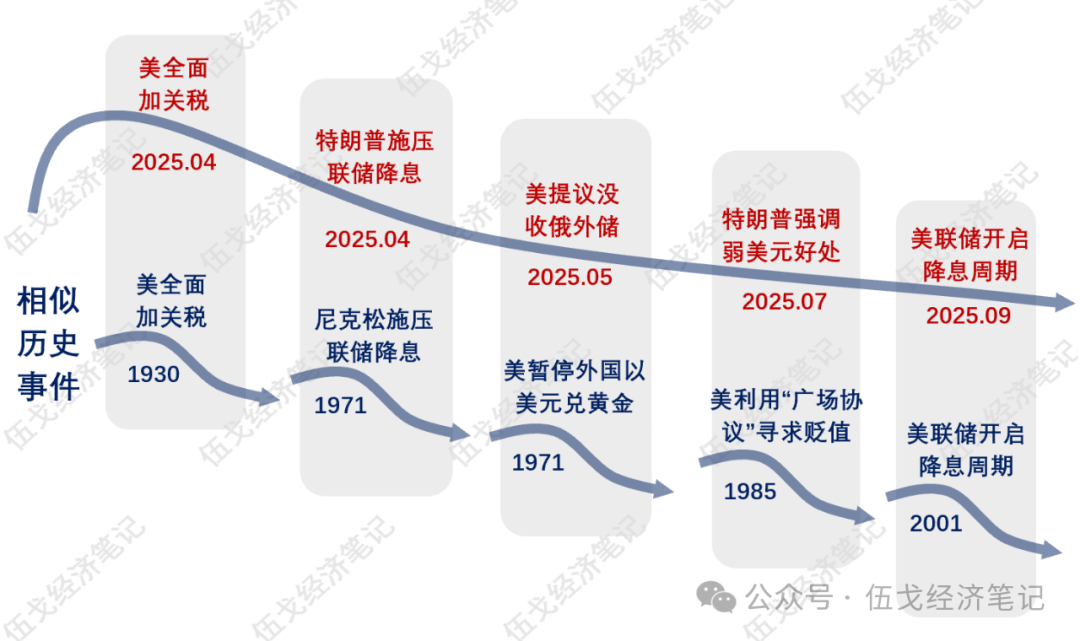 耐人寻味的是,近期以股票为代表的风险资产和以黄金为主的避险资产同步上涨,历史上这往往对应着美元的贬值阶段。除了传统周期性因素之外,市场对于关税的征收、联储的独立性、汇兑的安全性等担忧,或都指向本轮美元的调整将是结构性且深远的。