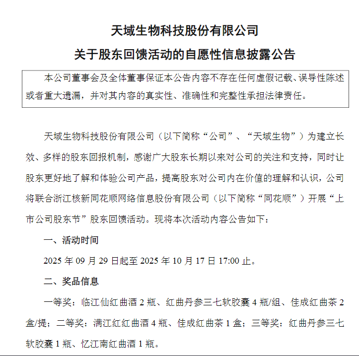 9月29日,天域生物(603717.SH)公告称,为建立长效、多样的股东回报机制,感谢广大股东长期以来对公司的关注和支持,同时让股东更好地了解和体验公司产品,提高股东对公司内在价值的理解和认识,公司联合同花顺(300033.SZ)开展股东回馈活动,活动时间为2025年09月29日至10月17日17:00。奖品包括红曲酒、软胶囊和红曲茶等。参与条件为活动期间持有过“天域生物”股票且个人交易账号可在同花顺App登录的投资者。